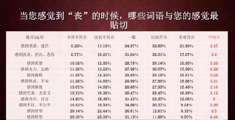 这些都跟“丧”的感受非常密切,然后“非常丧”和“比较丧”的比例超过了20%。所以从“丧文化”,到“躺平”、“佛系”这些词都非常流行。